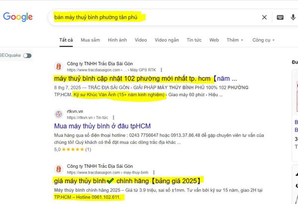 - Uy tín (Authoritativeness): Trắc Địa Sài Gòn là đơn vị uy tín, thường xuyên được tìm kiếm với các từ khóa như "bán máy thủy bình phường Tân Phú", "máy RTK chính hãng".